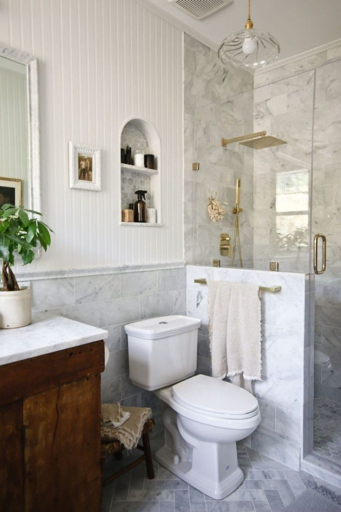 Apart from built-ins, use a mix of open and closed storage to keep the space feeling open but functional. What does that mean? Perhaps have a couple of open shelves for display or easy-access items (like daily-use toiletries in nice containers, or a plant for decor), combined with closed storage (like a vanity cabinet or a medicine cabinet) to hide the clutter like cleaning supplies, extra soaps, and not-so-pretty necessities. This combination prevents the small bathroom from feeling overstuffed with furniture.
